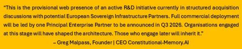 This provisional website page represents an R&D initiative in active structured discussions with European sovereign infrastructure partners. The initiative will be commercially deployed under the leadership of a principal partner, to be announced Q3 2026. Early technical engagement is by invitation and informs the architecture directly